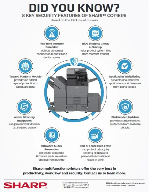 Sharp multifunction printers are designed with advanced security features to help guard against unauthorized access, data theft and other hacking attempts.