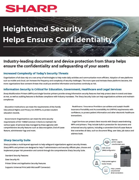 As MFPs and printers become parts of organizations․ integrated document workflows and business processes, security becomes a serious concern. Securely managing business and user data is critical for corporations to be successful. Sharp addresses these concerns by providing a suite of integrated security features designed to help protect your information and document assets.